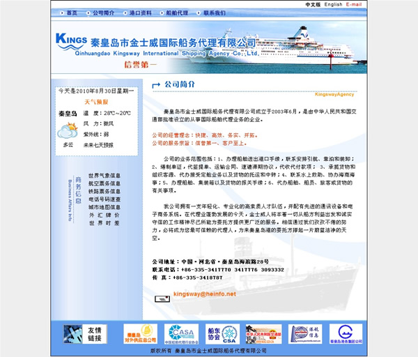 秦皇島市金士威國(guó)際船務(wù)代理有限公司成立于2003年6月,是由中華人民共和國(guó)交通部批準(zhǔn)設(shè)立的從事國(guó)際船舶代理業(yè)務(wù)的企業(yè)。