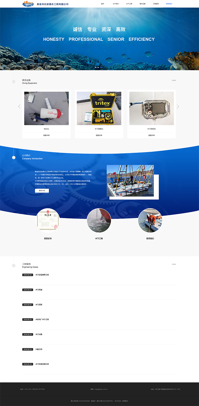 秦皇島兄弟潛水工程有限公司成立于2000年06月,由畢業(yè)于我國(guó)唯一的工程潛水學(xué)校——廣州潛水學(xué)校的盧銘臣等共同創(chuàng)立。公司位于環(huán)境優(yōu)美的海濱城市——秦皇島,是一家專(zhuān)門(mén)從事水下工程的專(zhuān)業(yè)公司。