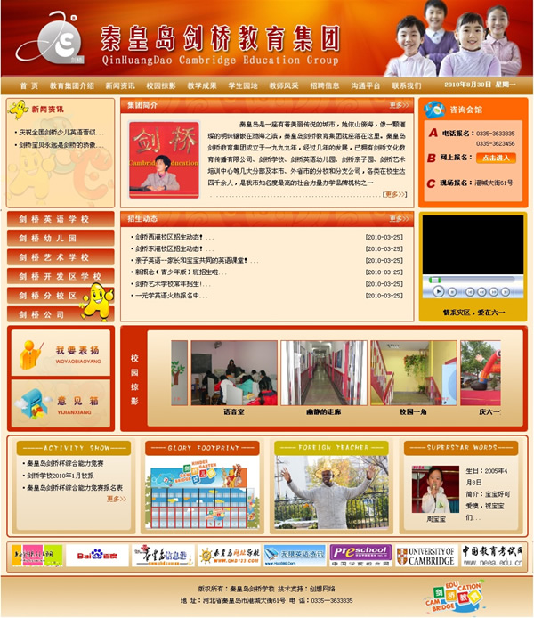 秦皇島是一座有著美麗傳說的城市,她依山傍海,像一顆璀璨的明珠鑲嵌在渤海之濱,秦皇島劍橋教育集團就座落在這里。秦皇島劍橋教育集團成立于一九九九年,經(jīng)過幾年的發(fā)展,已擁有劍橋文化教育傳播有限公司、劍橋?qū)W校、劍橋英語幼兒園、劍橋親子園、劍橋藝術(shù)培訓(xùn)中心等幾大分部及本市、外省市的分校和分支公司,各類在校生達四千余人,是我市知名度高的社會力量辦學(xué)品牌機構(gòu)之一 。