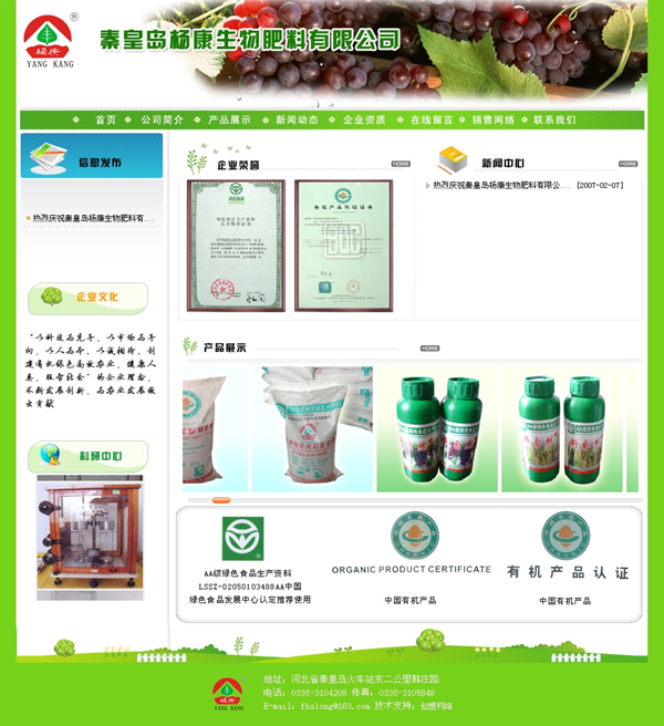 秦皇島楊康生物肥料有限公司坐落于全國(guó)著名的旅游海濱城市--------秦皇島.公司始建于1998年,引進(jìn)了美國(guó)新菌種技術(shù),結(jié)合我國(guó)的農(nóng)業(yè)生產(chǎn)實(shí)際,生產(chǎn)微生物葉面肥、微生物有機(jī)肥、有機(jī)無(wú)機(jī)復(fù)混肥,是華北地區(qū)較大的有機(jī)肥、葉面肥、有機(jī)無(wú)機(jī)復(fù)混肥的生產(chǎn)基地。公司為哈茲集團(tuán)、中國(guó)糧油華夏長(zhǎng)城(昌黎)釀酒有限公司的萬(wàn)畝釀酒葡萄基地、中國(guó)糧油煙臺(tái)長(zhǎng)城釀酒有限公司釀酒葡萄基地、朗格斯酒莊(秦皇島)有限公司等基地供應(yīng)肥料,其產(chǎn)品遠(yuǎn)銷(xiāo)泰國(guó)、馬來(lái)西亞、韓國(guó)、黑龍江、新疆、山東、山西、福建、河北、河南等國(guó)家和地區(qū)。