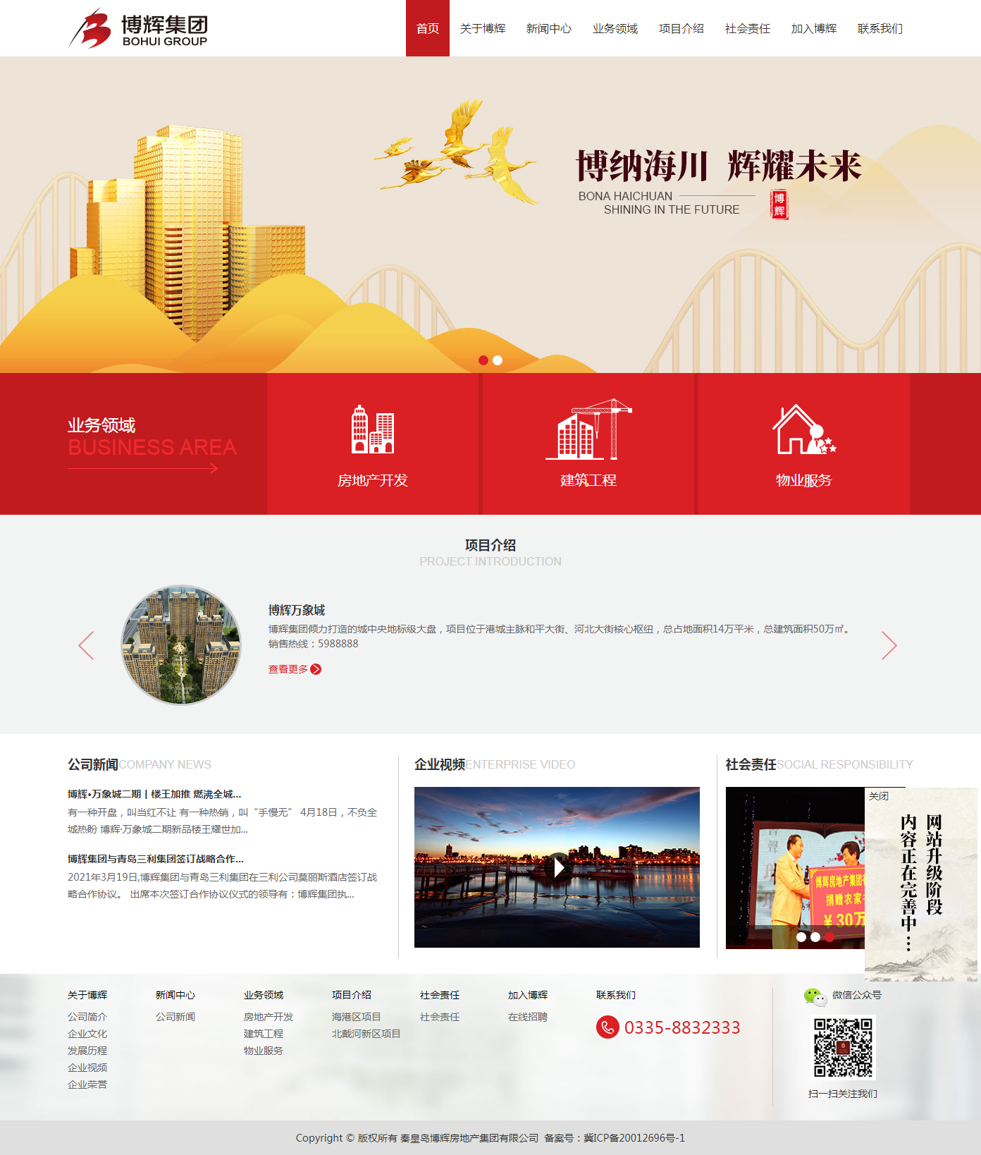 博輝集團創(chuàng)立于2003年,總部位于美麗的濱海城市秦皇島,是一家以房地產(chǎn)開發(fā)為主,集建筑工程、物業(yè)管理等為一體的多元化發(fā)展的集團公司。集團一直致力于城市發(fā)展建設,積極響應國家號召參與新農(nóng)村建設,為改善本地區(qū)百姓的居住環(huán)境、提升旅游文化發(fā)展、帶動本地區(qū)經(jīng)濟繁榮和城市發(fā)展貢獻力量。